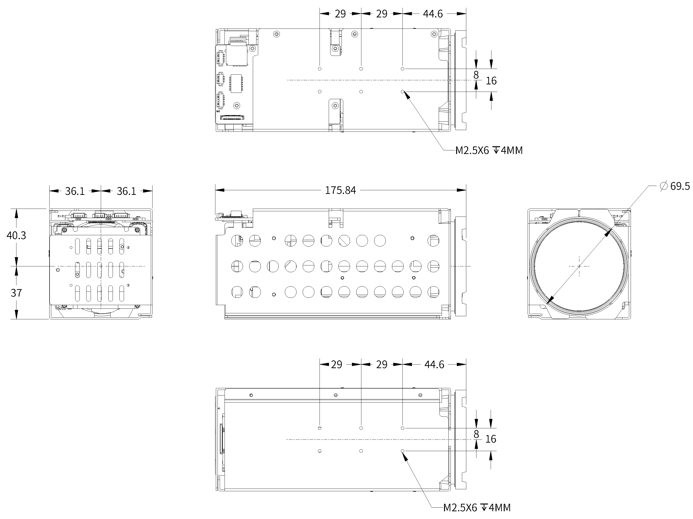 4pin Ethernet Port, 6pin Power & UART port, 5pin zvukový port. 30pin mipi |